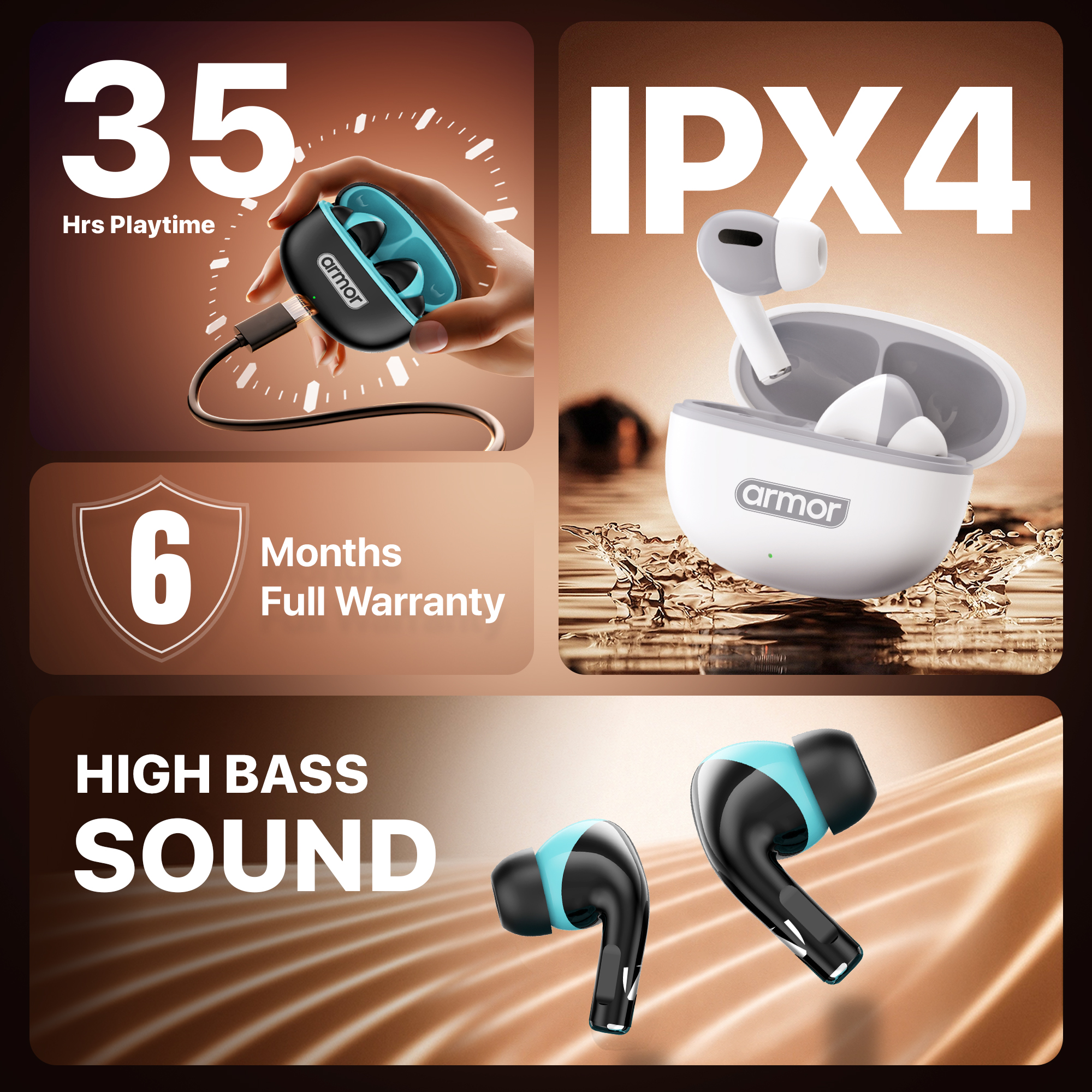 Lightweight, stylish, and comfortable, the Armor AR-BUDS 170 is available in Black, Blue, and White, giving you both performance and style in one compact package. For added peace of mind, it also includes a 6-month warranty.